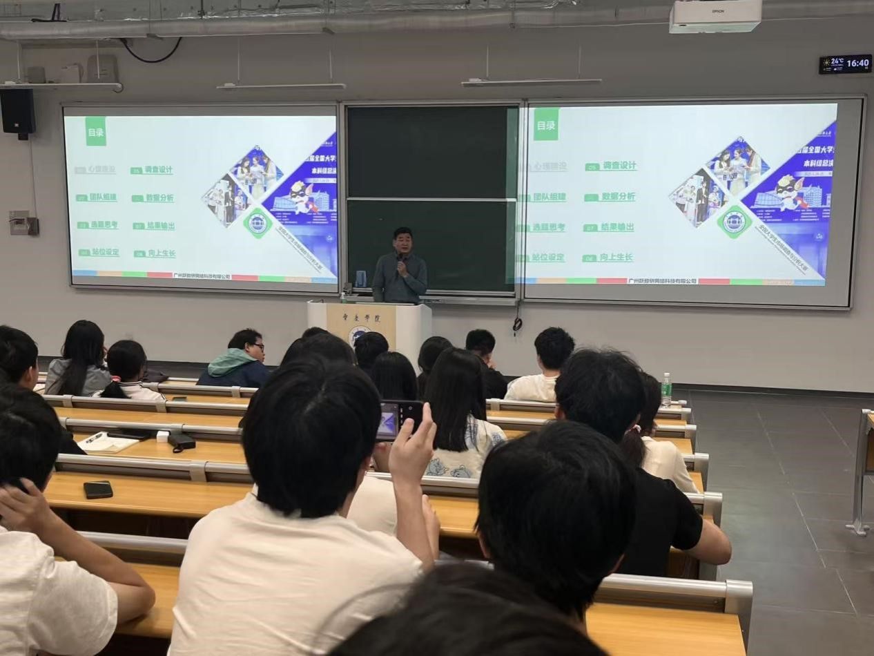 随后,吴总以“业界评委视域下的全国大学生市场调查与分析大赛”为题,从大赛规格、备赛要点与能力提升三个维度展开分享。他强调应组建能力全面的“六边形战队”,选题宜“小题深做”,并深入解析了问卷设计与数据分析的关键环节,为备赛同学指明了方向与重点。